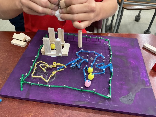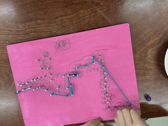 今日は、前回打ち込んだ釘に毛糸を巻きつけて飾り付けをしました。