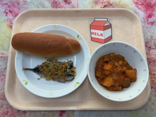 今日はパンが主食の献立です。給食室に入ったらマヨネーズの匂いが漂っていました。匂いの正体はニンニク風味のマヨネーズソースをのせて焼いた「イワシのガーリック焼き」です。パン粉にこんがり焼き色がついて美味しく出来上がりました。