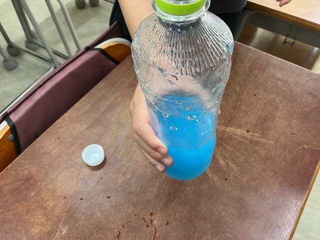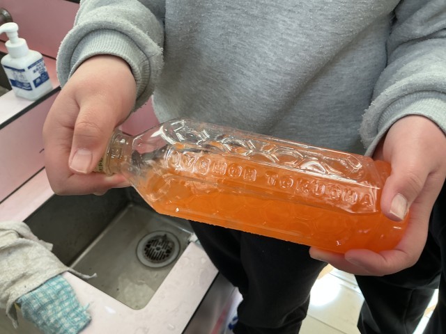 材料は、お花紙と水だけです。ペットボトルに好きな色のお花紙と水を入れてよく振ると・・・色が大変身!紙がよく溶けて、きれいな色水になりました。