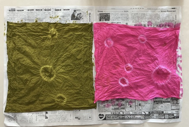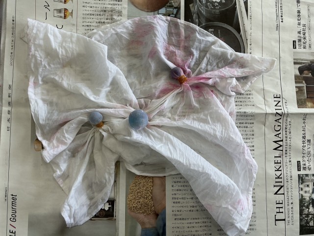 まず、模様を想像しながら、ビー玉を布に包んでぎゅっと結びつけていきます。次に、ドキドキしながら染料に浸して広げると…真っ白だった布に鮮やかな模様がパッと浮かび上がりました。