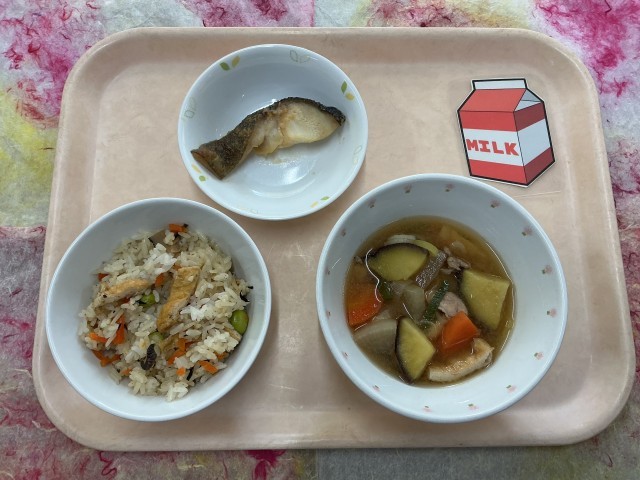 今日はお魚が主役の和食献立です。西京味噌を使った甘めの味付けでぎんだらを焼きました。五目ごはんもいろいろな具材が入っています。石川県の郷土料理である「めった汁」は豚汁のように見えますが、じゃがいもの代わりにさつまいもが入っているのが特徴です。