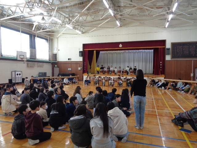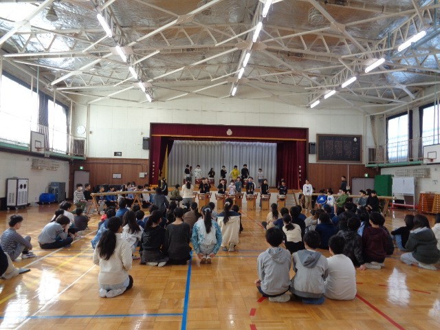 山崎太鼓バトンタッチに向けて6年生と5年生の教え合いの様子です。
