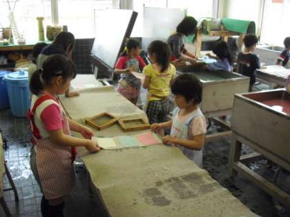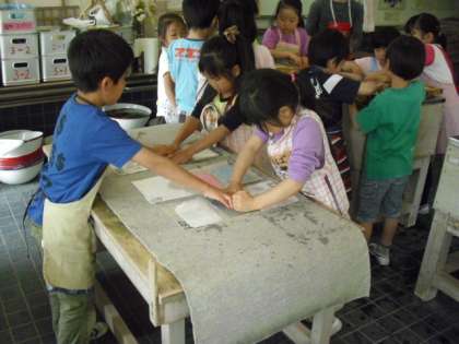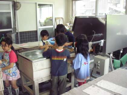 伝統工芸室で、1・2年生がはがきを漉きました。2年生が先生になって、初めて紙漉きを行う1年生に優しく教えていました。このようにして、山崎小の伝統は受け継がれていきます。