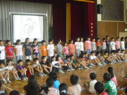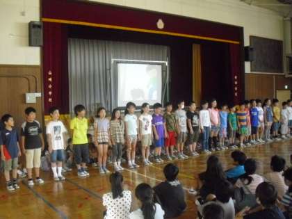 今日の、詩の発表朝会は、4年生が担当しました。谷川俊太郎作、「これはのみのぴこ」を4年生全員で声をあわせて、リズミカルに発表しました。