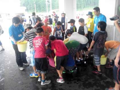 舟形交流2日めになりました。ホームステイ先から元気に登校した子供たち。始めての鮎つかまえに歓声を上げています。