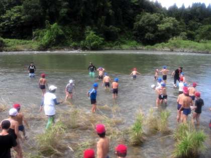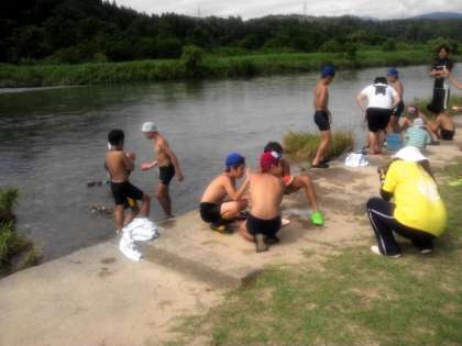 昼食後、川遊びをしました。少し水は冷たかったですが、お父さん方の見守りのなか、楽しく水遊びをしました。休憩時にいただいたスイカ、キュウリ、とてもおいしかったです。