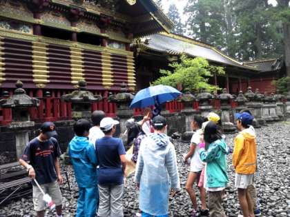 日光東照宮を4つのグループに分かれて、ガイドさんの説明を真剣に聞きながら見学をしています。