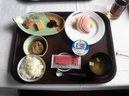 二日めの朝食です。献立は、味噌汁、ロースハム、がんも、焼き魚、玉子焼き、ご飯、ヨーグルトです。しっかり食べて頑張りましょう。