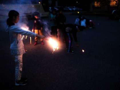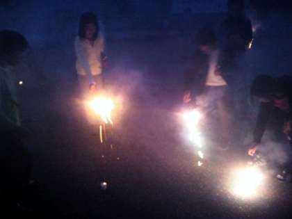 ホテルの駐車場で花火をしました。グループごとにわけあって楽しみました。