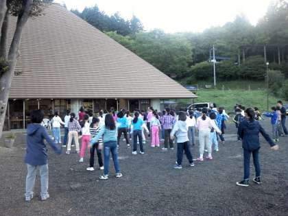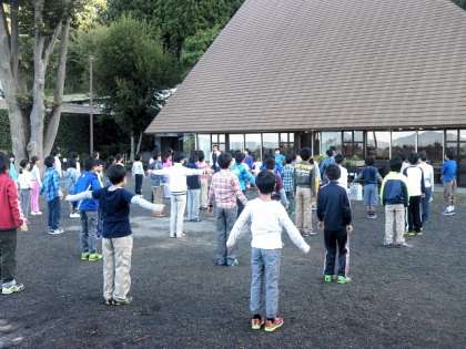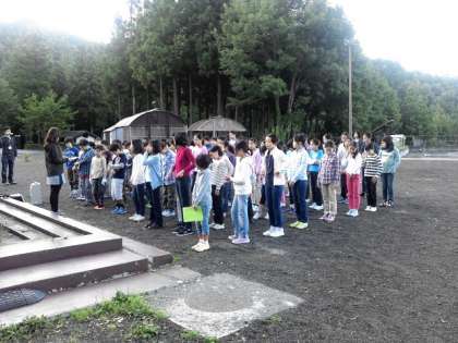 移動教室2日めの朝を迎えました。少し肌寒いですが、天気は最高です。眠そうな子もいますが、みんな元気に朝会に参加しています。