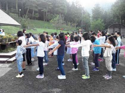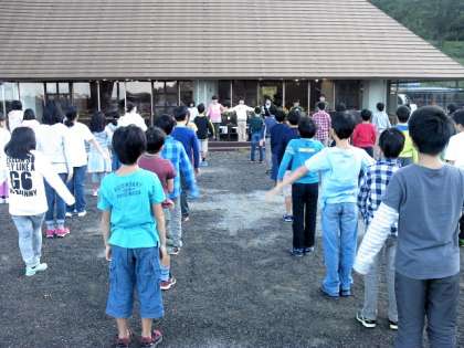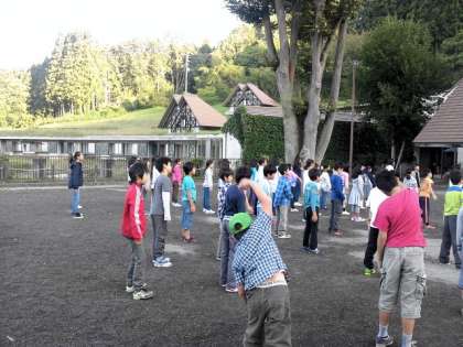 移動教室最終日の朝です。昨日は、登山の疲れもありゆっくり休めたようです。みんな元気に朝会に出ています。残り少ないなかのビレジでの生活です。協力して片付けをがんばります。