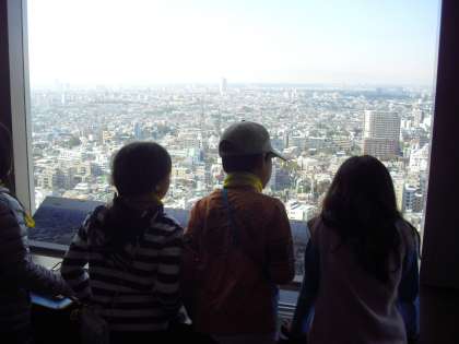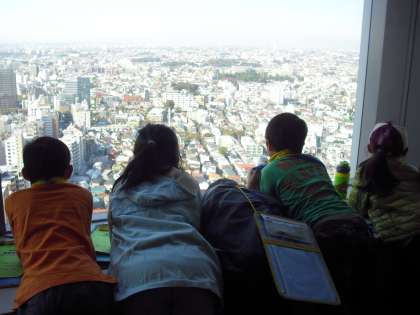 三軒茶屋のキャロットタワー26階の展望室から、区内の様子を見ました。天気もよく、遠く富士山も見られました。山崎小学校を見つけて喜んでいました。