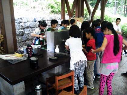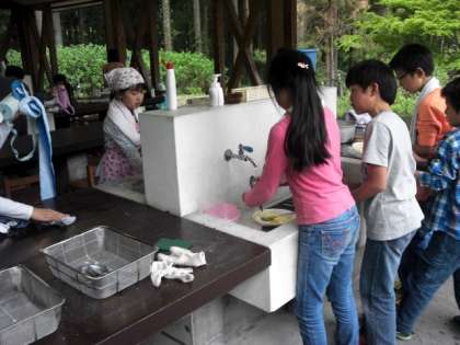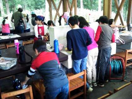 無事にごちそうさまが終わり、協力して片付け中です。夜は、きもだめしを行います。