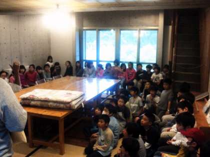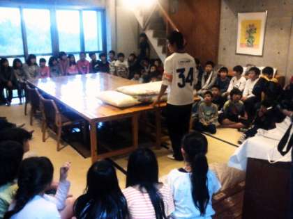 明日の朝の布団の片付けについて説明を受けています。みんなで協力してできるようにして欲しいと思います。