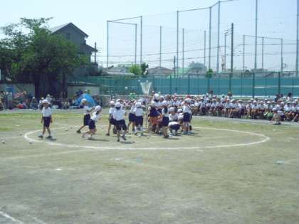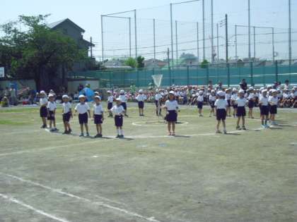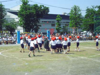 小学校に入って始めての運動会。1年生の最初の種目は「ぜんぶたまいれ」でした。赤も白も力一杯にかごに向かって玉を投げました。