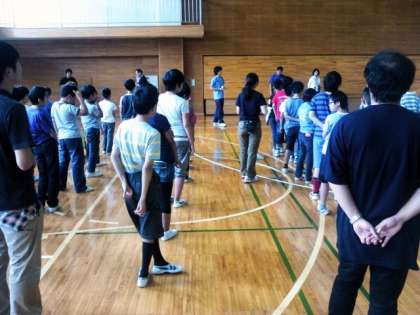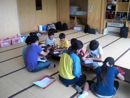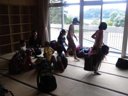 部屋に入って、荷物整理をしました。避難訓練の後、開園式を15校の友達が体育館にそろって行いました。3日間仲良く過ごしてほしいと思います。開園式の後は、部屋で手紙を書いています。