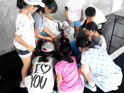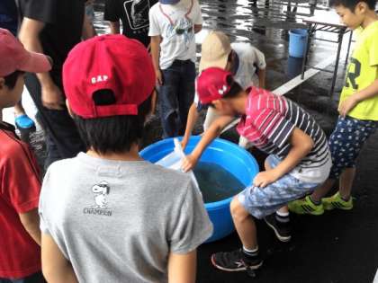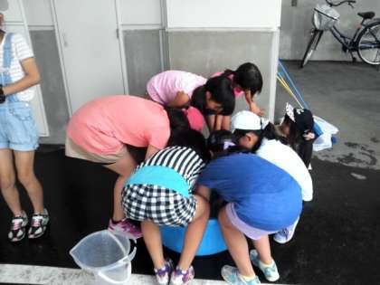 二日めの最初のプログラムは、たらいでの鮎つかみです。グループ毎に鮎を捕まえています。はじめての感触に歓声があがっています。