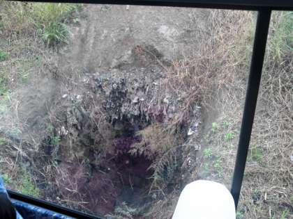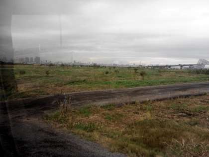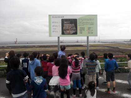 バスに乗って中央防波堤埋立処分場の見学をしています。1か所、バスを降りて見学させてもらいました。