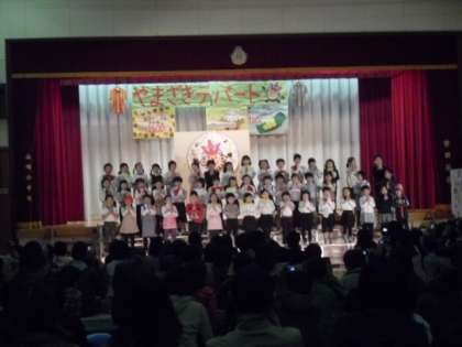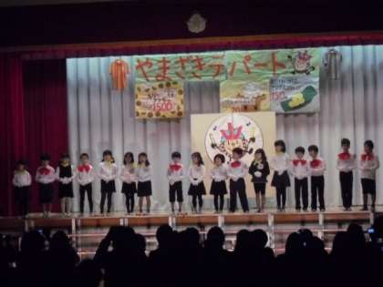 「学習発表会は、学校で学んだことを発表するんだよ。」と練習を始める前に子どもたちに話しました。そして、4月から学習してきたことをたくさん盛り込んだ『やまざきデパート』を開店し、「うえへまいりまぁす」の練習に一生懸命取り組んできました。一人二役あり、さらに合奏や合唱など出番も多かった子どもたちです。練習を重ねるごとに動きがスムーズになり演技も上手になってきました。大人の手を借りることなく自分たちの力だけで演じきることができた学習発表会になりました。