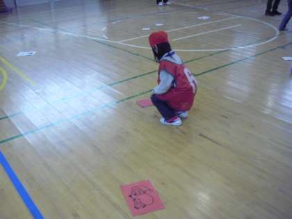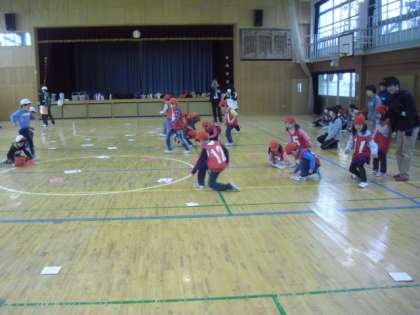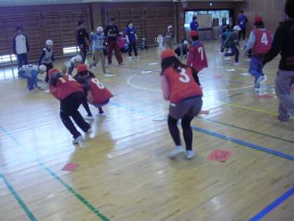 「紅白オセロ」では、紅組の山崎小は、白く変えられたカードを素早く赤に裏返していました。低学年も高学年も紅組が勝ちました。みんな大喜びでした。