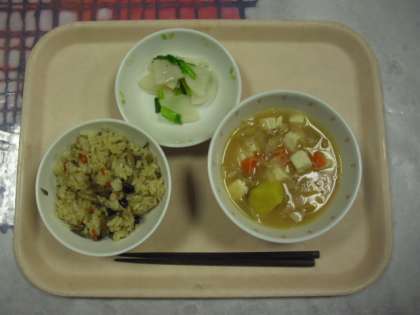きのこごはんには、しめじ、えのきだけが入っています。きのこは、たくさんの種類があります。世界中では、1万種類といわれていますが、そのうち食べられるきのこは、100〜300種類です。