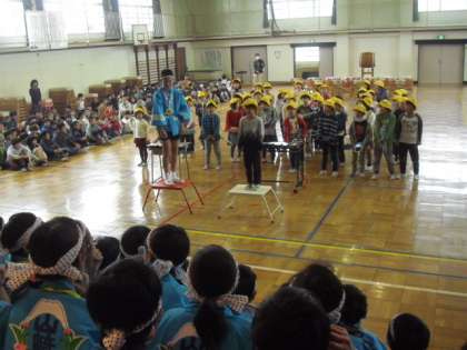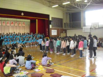 体育館に全学年の子どもたちが集まり、25日に卒業する6年生に感謝の気持ちを表す「6年生を送る会」を行いました。運営・代表委員の子どもたちが司会をし、各学年が練習してきた出し物を披露しました。6年生も笑顔で下級生の出し物をみていました。
