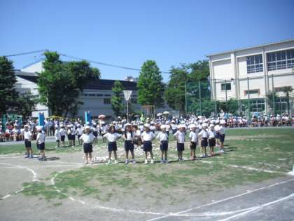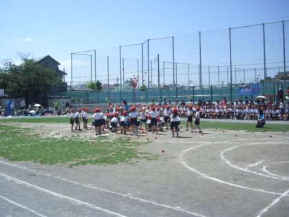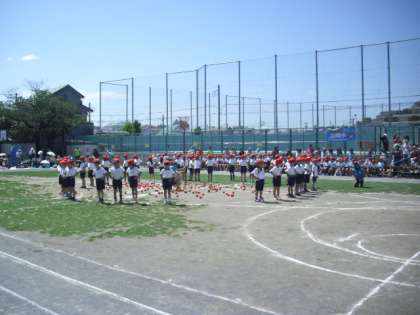 小学校に入って始めての運動会。1年生の最初の種目は「おどって玉入れ」です。赤も白も元気に踊り、かごに向かって力いっぱい玉を投げました。