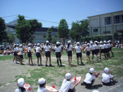 午前最後の演技は、全校での「花笠音頭」です。舟形町との交流の中で始まり、長年踊り続けられています。今年も6年生が昨年の夏の交流で教えてもらった「傘おどり」を力いっぱい披露してくれました。