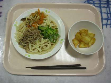 五目冷やしうどんには、もやし、きゅうり、ぶた肉、しいたけ、油揚げ、にんじんなどのたくさんの具が入っています。うどんには、氷が一緒に入っているのでよく冷えています。暑い時期や食欲がないときにもさっぱりと食べられる料理です。