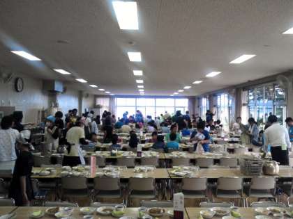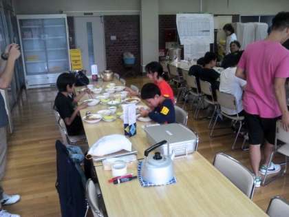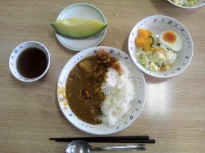 学園の食堂で食べる初めての食事です。15校の友達みんなで仲良く食べます。献立は、カレーライス、盛合わせサラダ、メロンです。