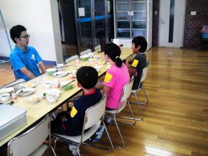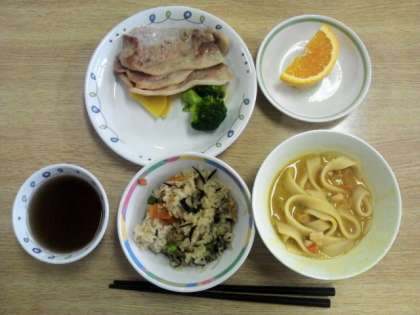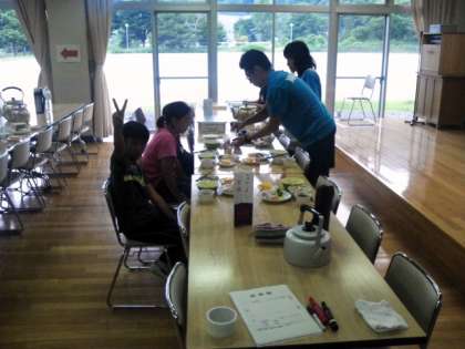 学園での二回めの夕食です。ハイキングでお腹もすきました。しっかりといただきます。献立は、炊き込みご飯、ほうとう、豚ロースのソテー、ゆでブロッコリー、たくあん、オレンジです。夕食の後は、午後7時から楽しみにしている子ども会です。
