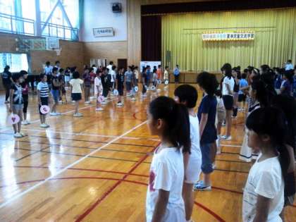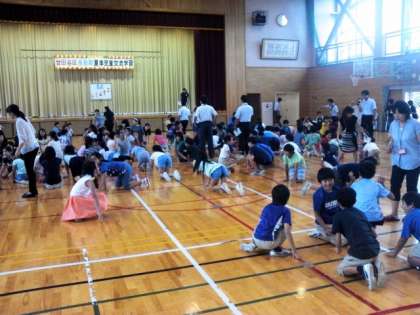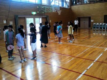 体育館で3校の5年生の対面式がはじまりました。自己紹介をしてゲームを楽しんでいます。3日間一緒に活動します。よろしくお願いします。