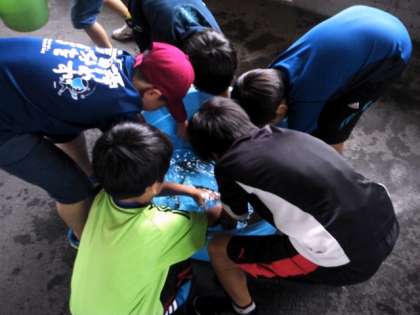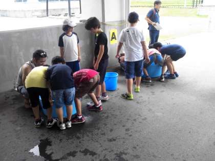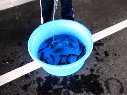 たらいでの鮎つかまえが始まりました。初めての体験に歓声が上がっています。つかまえた鮎は、舟形のお父さんたちが塩焼きにしてくれます。男の子が挑戦しています。