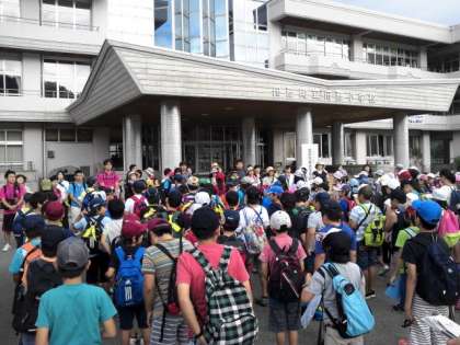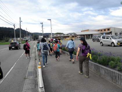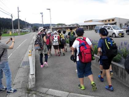 いよいよウォークラリーに出発です。一緒に歩いて下さる保護者の方にあいさつして出発しています。協力してクイズに挑戦しながら取り組みます。
