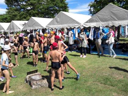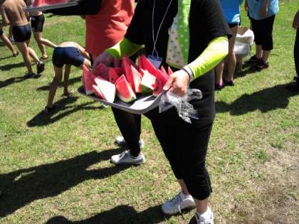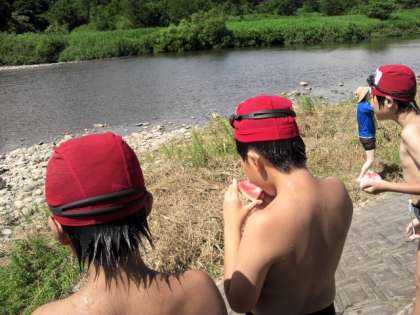 2回めの休憩。スイカをいただいています。甘くてもおいしいです。。