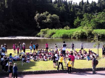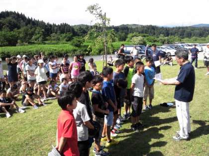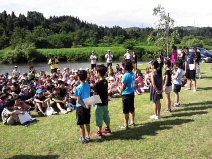 水遊びを終えて着替えて終わりの会をしました。ウォークラリーの表彰では、満点で優勝のチームがでました。そのほかの班もがんばりました。今日の感想を発表して終わりの会を終え、集合写真を撮って今日の活動を終えました。