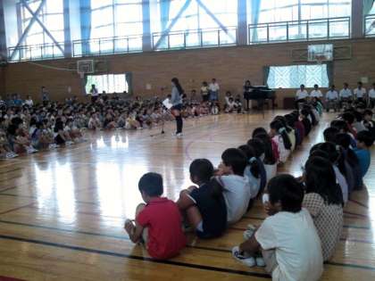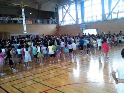 楽しかった時間は、あっという間にす過ぎます。体育館でのお別れ集会をしています。体育館全体に交流の歌「友だちの歌」が響いています。