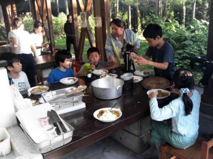かまどの火がなかなかつかず、苦労した班もありましたが、どの班もカレーライスが完成しました。みんなで苦労して作ったカレーライスの味は格別です。いただきます。