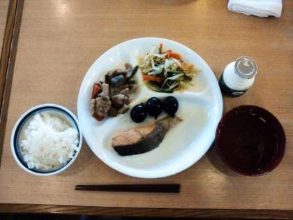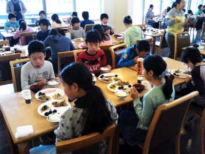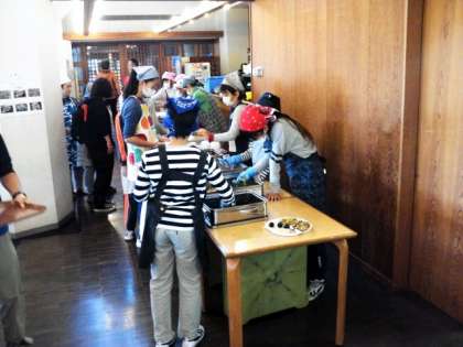 食堂でのはじめての食事です。食事係が準備をがんばりました。山登りに向けてしっかり食べます。献立は、ごはん、塩焼鮭、筑前煮、青菜のおひたし、ねぎとわかめのすまし汁、果物、飲むヨーグルトです。
