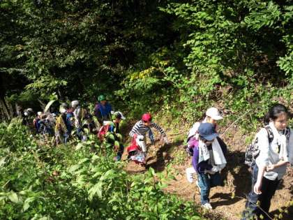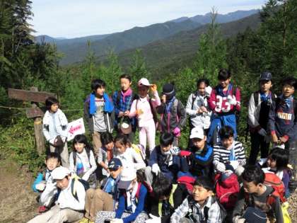クラス写真を撮っています。頂上は、まだまだです。