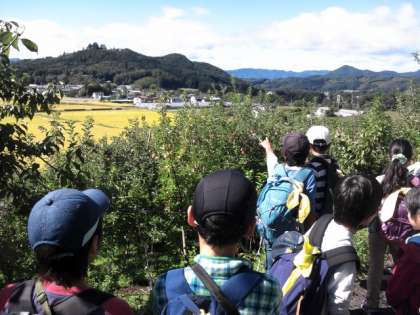 りんご園に到着。りんごや川場村についてお話を聞いています。