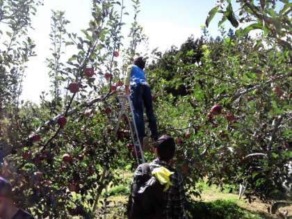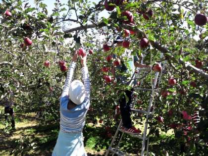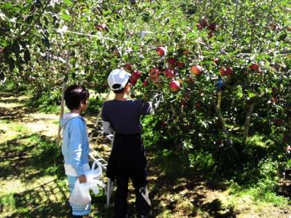 説明を聞いて、りんごをもいでいます。おいしいりんごがとれたでしょうか。持って帰るのをお楽しみに。