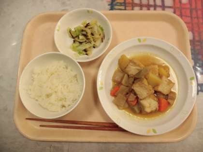 五目うま煮には、ぶた肉とごぼう、こんにゃく、にんじん、じゃがいも、たまねぎなどたくさんの野菜が使われています。野菜の栄養とおいしさがたくさんつまった煮物になっています。