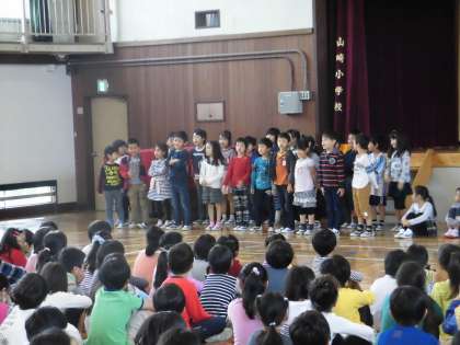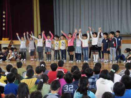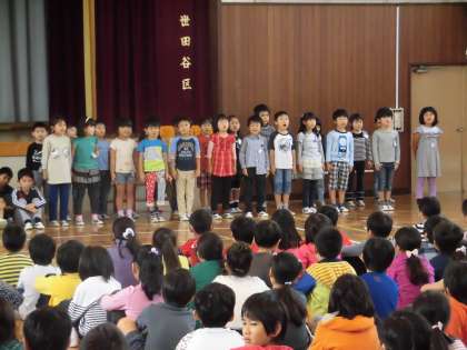 1年生が、初めての詩の発表を体育館でしました。2年生から6年生が見ている中、大きな声で、動作もつけて元気に発表を行いました。最初に、1年生全体で国語で習った、まど・みちお作「ちょうちょう ひらひら」を、次に学級ごとにくどうなおことのはらみんな「のはらうた」から1組は、「こころと あし  むかで やすじ」、2組は「おはよう  こざる いさむ」、3組は「えーん!  くりのみ しょうへい」を発表しました。