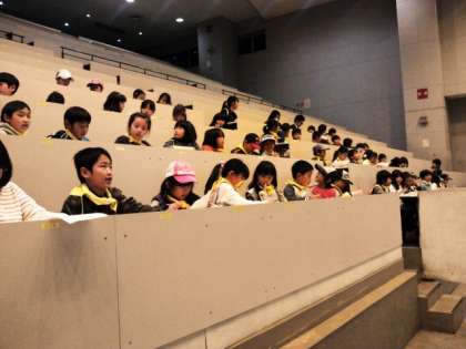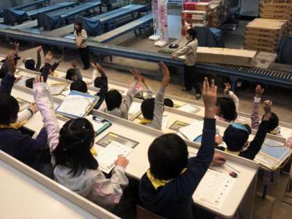 花のせり会場で説明を聞いています。ここでもクイズに挑戦しています。プレゼントがあるようです。