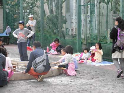 雨が心配されましたが、遊び場開放委員会のみんさんによる好例の「あそぼうパン」が行われました。楽しみにしていた子どもたち。我先にと炭火のまわりに集まって、棒の先につけたパンの生地をかざしてパン焼きに挑戦しました。炭火に近づけすぎると焦げてしまいます。1回目より2回目、2回目より3回目とだんだん上手に焼けるようになってきます。自分の焼いたパンはとてもおいしく、みんな笑顔で平らげていました。温かいシチューもとても美味しかったです。遊ぶ場開放委員の皆様、お手伝いいただいた皆様ありがとうございました。