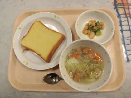 ビーンズサラダには、ひよこ豆、白いんげん豆が入っています。豆はたんぱく質はじめ、さまざまな体の健康に必要な栄養素をバランスよく含んでいます。豆の苦手な人もいるかもしれませんが残さず食べましょう。