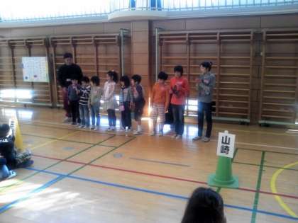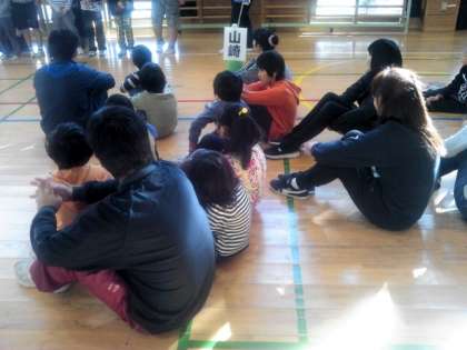 旭小学校で、弦巻小学校、三宿小学校の友達と今年度2回めの4校交流会をしています。久しぶりの交流です。あいさつをしてからゲームをはじめます。