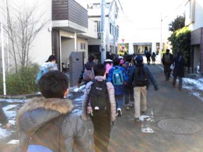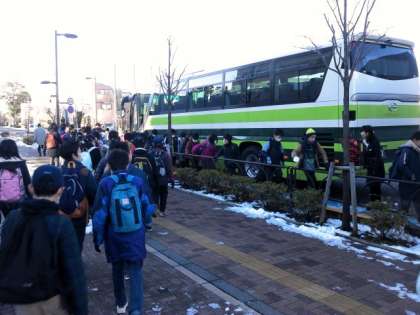 5年生が社会科見学に出発します。見学場所は、JFEスチール東日本製鉄所と森永製菓鶴見工場です。天気は、いいですが雪が残っているので、気をつけて行ってきます。
