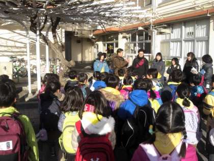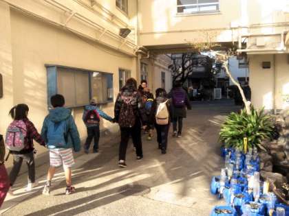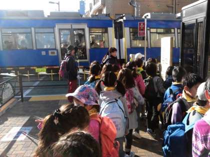2年生と仲よし学級が小松菜採りにバスに乗って行きます。天気もいいのでたくさん採ってきます。